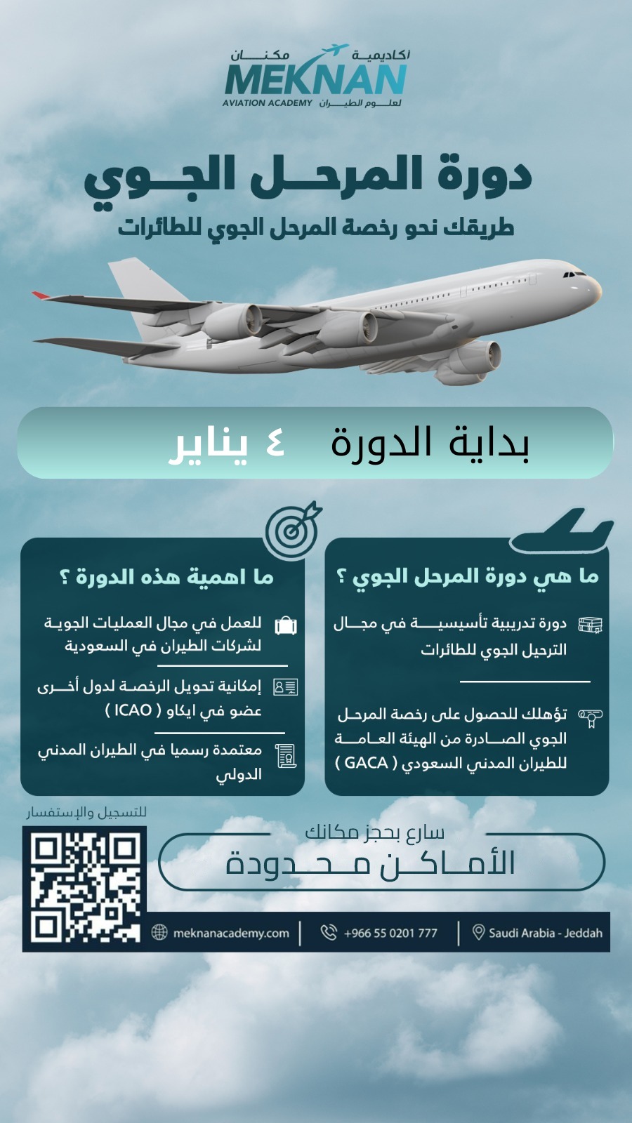 تتشرف أكاديمية مكنان لعلوم الطيران بالإعلان عن إطلاق دورة المرحل الجوي Aircraft Dispatcher الجديدة بتاريخ ٠٤ يناير ٢٠٢٦م.